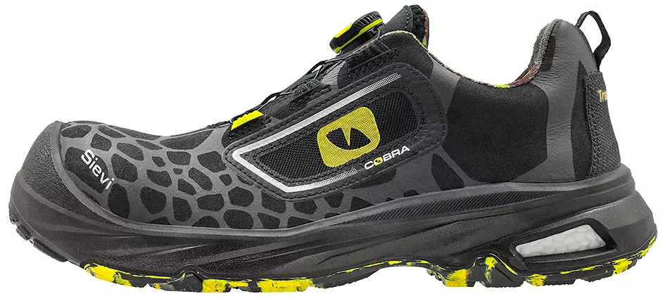 Sievi Cobra 1 Roller+ S1P on sporttinen ja hengittävä matala turvakenkä. Turvakengässä on kevyt metalliton komposiittinen turvakärki, joka eristää hyvin lämpöä ja kylmyyttä. Teräksinen naulasuoja ehkäisee terävien esineiden tunkeutumista pohjan läpi. BOA® Fit-kiinnitysmekanismi lisää käyttömukavuutta. Nauhoitus lukitaan painamalla rulla alas ja kiristäminen tapahtuu vain rullaa pyöräyttämällä! Kengät ovat myös helppo riisua; nauhoitus vapautuu vaivattomasti nostamalla rullaa. Kengän päällinen on vettä ja likaa hylkivää mikrokuitua. 3D-dry® -vuori siirtää kosteuden pois jalan pinnasta pitäen ne kuivina. PU-kärkikuppi tekee tästä turvakengästä sopivan myös kovaan käyttöön. Sievi Cobra turvakengässä on TractionPro -kitkapohja, joka varmistaa erinomaisen pidon ja kulutuskestävyyden sekä antaa iskunvaimennusta etenkin jalan tukialueille. Kengässä on maailman kehittynein kantavaimennus, jonka perustana on Sievi FlexEnergy® -joustoelementti. Elementti sitoo syntyvää liike-energiaa ja palauttaa energiasta yli 55 % askellukseesi. Pohja kestää öljyä ja useita kemikaaleja sekä kuumuutta jopa 300°C asti. Näillä kengillä voi helposti työskennellä turvallisesti niin sisä- kuin ulkotöissäkin!